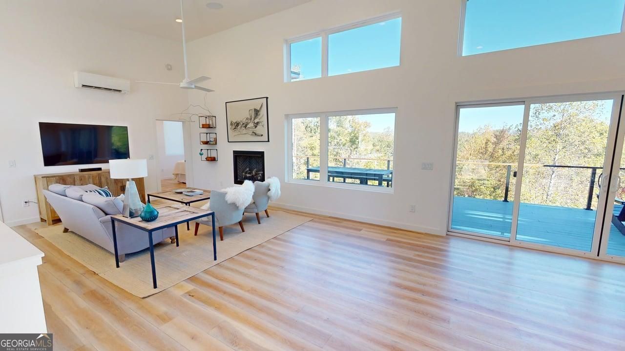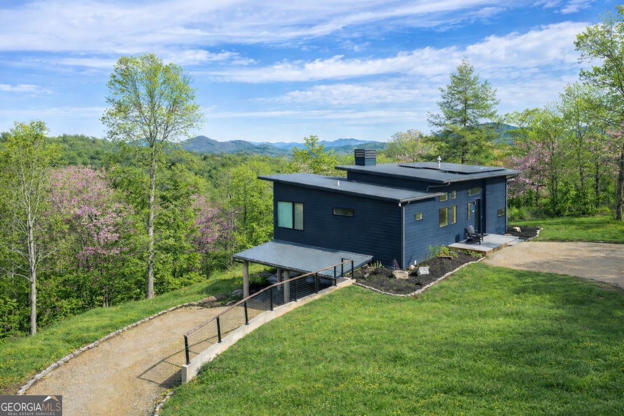 Modern in the Mountains just steps from the pool! This contemporary 2-story residence in Young Harris offers 4 bedrooms and 3.5 bathrooms in meticulously designed living space, perfectly positioned to capture stunning, long-range North Georgia Mountain views. 2 en-suite bedrooms on main level. 2 more bedrooms downstairs plus a hangout area, this home blends modern style with everyday comfort in a picturesque setting. The open-concept main floor showcases a gourmet kitchen, stainless steel appliances, and a large center island that flows seamlessly into the dining and living areas, ideal for entertaining. Large windows and sliding glass doors flood the space with natural light while framing breathtaking mountain vistas. Living room is anchored by a sleek fireplace with direct access to an expansive deck, creating effortless indoor-outdoor living. Premium touches like hardwood floors, white shiplap walls, and high ceilings create a bright, airy ambiance. Each of the four bathrooms features contemporary fixtures and finishes, including custom vanities and luxurious showers designed for a spa-like experience. Ample storage, energy-efficient appliances, central vacuum, and advanced climate control systems. Outdoor living is just as impressive, with an expansive upper deck, a screened lower-level deck, and a private hot tub with adjacent outdoor shower. Upgraded solar panels with battery backup upgrade enhance energy efficiency and provide peace of mind. 2 covered parking spaces and room more. Electric Vehicle charging, smart lighting, whole-home speaker system. Enjoy refined mountain living in one of North Georgia's most scenic and progressive communities, The Nest at Brannon Ridge. Resort-like amenities include saltwater pool with attached year-round spa, sauna, fitness center, community firepit, picnic pavilion, and walking trails. Easy income-producing with optional vacation rental management on site or keep it all to yourself for the ultimate modern mountain retreat.
