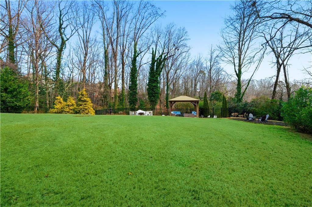 Designed for privacy, quiet, spacious living, and refined entertaining, this Sandy Springs estate, set well back from the road behind a gated entrance, sits on 1.17 private acres, offering a large flat backyard, saltwater pool, and serene woods with rare Atlanta skyline views. Nearly 9,600 square feet of thoughtfully designed living space showcases 10-foot ceilings, hardwood floors throughout with no carpet, and timeless New England-inspired architecture. A stately stone façade and arched entry create a strong first impression. Inside, five ensuite bedrooms, five full baths, and three half baths provide exceptional functionality, along with a flexible upper-level bonus room. Exposed wood beams, detailed millwork, and five fireplaces add warmth and architectural character throughout the main living spaces. The chef's kitchen features dual marble islands, a walk-in pantry, shiplap ceilings, a Thermador range, Sub-Zero refrigerator, and two dishwashers, and a full wet bar complete with a beverage refrigerator and wine fridge, designed for both everyday living and seamless entertaining. A spacious keeping room comfortably accommodates 10+ guests. A screened porch with fireplace and warm stained wood ceiling detailing overlooks the flat backyard and flagstone saltwater pool. The primary suite occupies its own wing upstairs with dual walk-in closets and stunning marble bath. A main-level guest suite offers ideal flexibility for visitors or multigenerational living. Additional highlights include two laundry rooms, a four-car garage with EV outlet, a dedicated marble dog wash, and large cubbies in the mudroom. The finished terrace level with 12-foot ceilings features a full secondary kitchen ideal for longterm guests or expanded entertaining. The terrace level also offers space for a media room, recreation area, wine cellar, golf simulator, gym, or future bedroom suite. Outdoors, enjoy multiple entertaining areas, a stone-floor gazebo, and a gated entrance, all minutes from Buckhead and Sandy Springs shopping and dining, major interstates, and around .5 of a mile to Holy Innocents' Episcopal School.