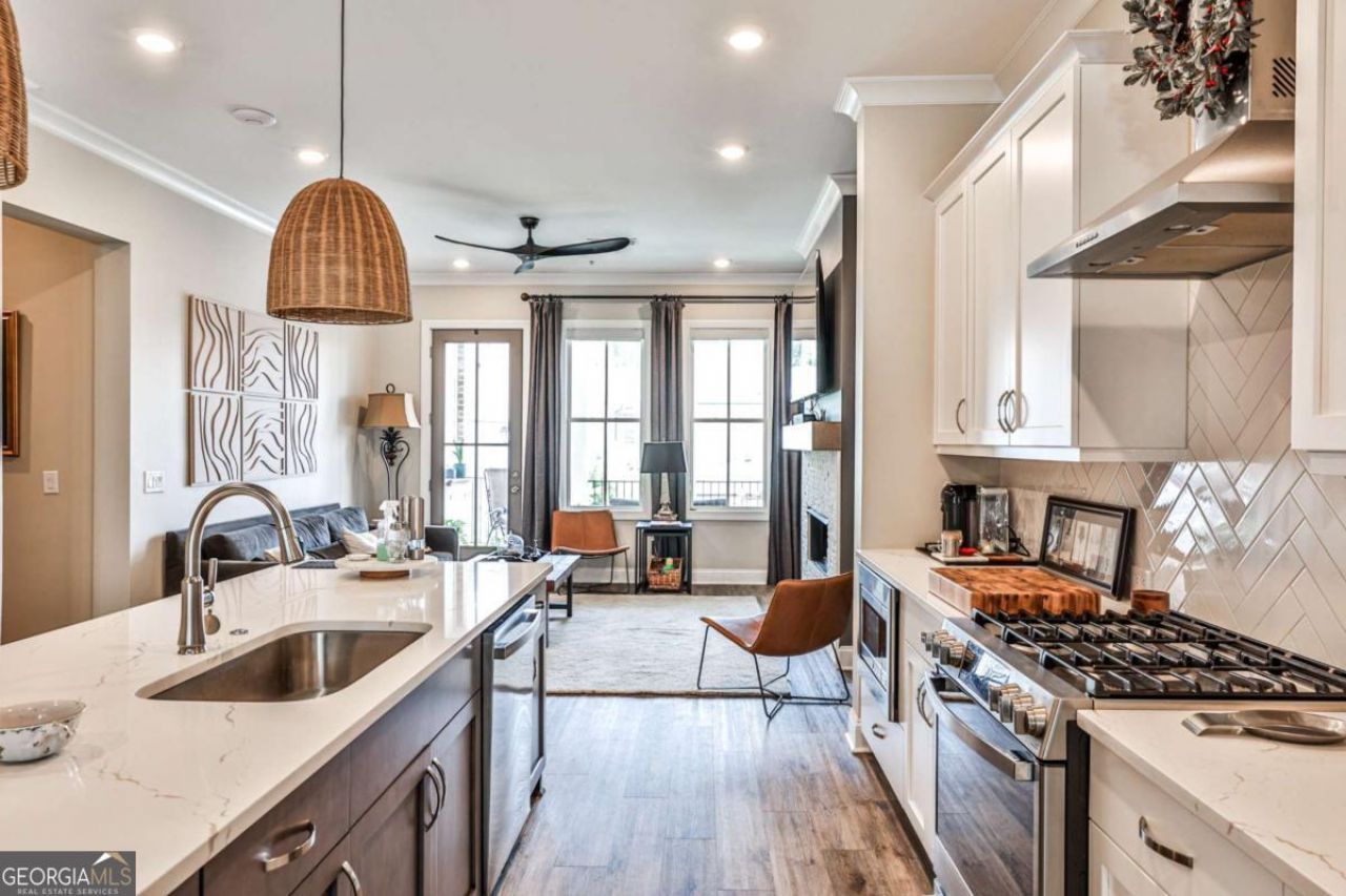 Welcome to this beautifully crafted, move-in ready condo nestled in the prestigious gated community of Waterside in Peachtree Corners. This immaculate 2-bedroom, 2-bath home offers the perfect blend of upscale finishes, functional design, and low-maintenance living - all just minutes from The Forum, top schools, and the scenic Chattahoochee River. Step inside to discover a bright, open-concept floor plan with soaring 10-foot ceilings, oversized windows, and designer touches throughout. The gourmet kitchen is the heart of the home, featuring Cambria Marble countertops, a large island with seating, stainless steel gas appliances, and a walk-in pantry. The spacious living room flows seamlessly to a private covered patio - perfect for relaxing or entertaining. Waterside is a gated, master-planned community offering luxury amenities including a resort-style pool, clubhouse, fitness center, pickleball courts, walking trails, and direct access to the Chattahoochee River. HOA includes lawn maintenance and exterior upkeep for a lock-and-leave lifestyle. Don't miss your opportunity to live in one of Peachtree Corners' most desirable communities - where nature, luxury, and convenience come together.