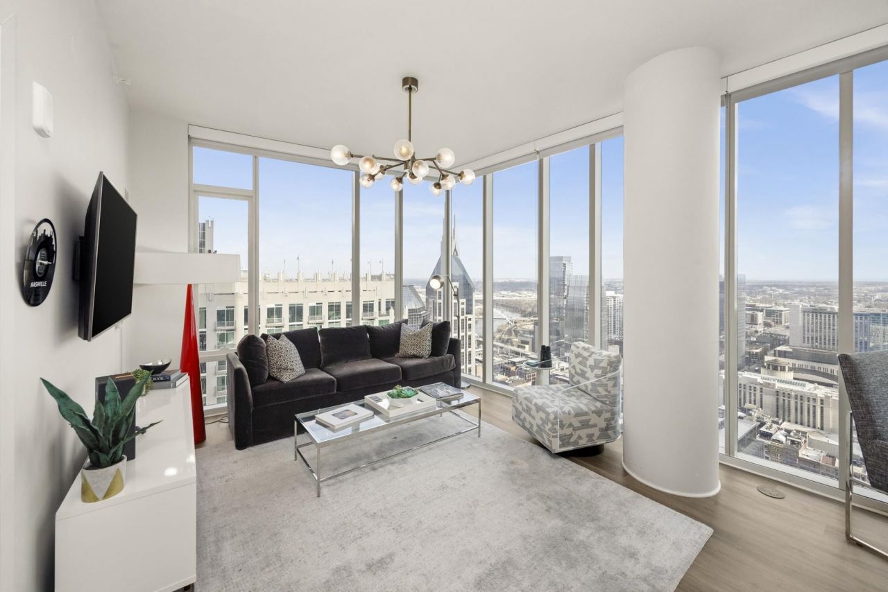 CORNER UNIT WITH BALCONY!! Rare offering on the coveted Southeast corner of the 505 Tower with floor to ceiling windows providing spectacular views of downtown Nashville and a front row seat to the city's many firework displays. This condo will convey furnished with Mitchell Gold designs. In addition, the condo has brand new flooring in the entry, kitchen, and living area. Both bedrooms are ensuite with large walk in closets. Private parking area is located on B1, with easy access to the elevator. The 505 Tower is perfectly situated with direct access to all things Nashville--Ryman Auditorium, Bridgestone Arena, Nissan Stadium, 5th and Broad/Assembly Hall, Broadway, the newly renovated Arcade, and Nashville Yards. Exterior amenities include a resort style pool with cabanas, tennis court, pickleball court, and dog park. Interior amenities include a private owners' lounge, state-of-the-art fitness center, private training center, massage room, private Italian-inspired wine/dining room, 24 hour coffee bar, and a catering kitchen/dining room.
