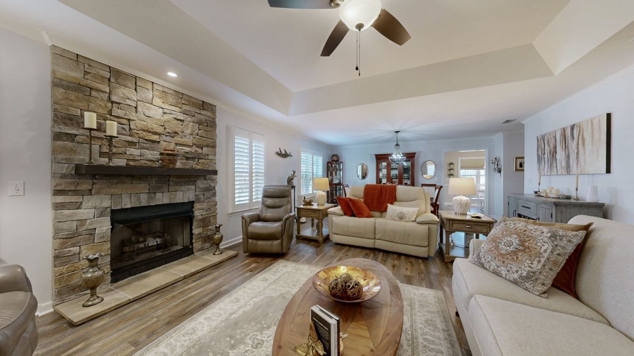 From the inviting COVERED FRONT ROCKING CHAIR PORCH to the bright, welcoming foyer, this home makes an immediate impression. Inside, you'll find attractive, UPDATED FLOORING, crown molding, and neutral tones. The spacious living room is anchored by a striking STONE FIREPLACE AND TREY CEILING, and the adjoining dining area offers plenty of room for gatherings. Plus, there is a ADDITIONAL, SPACIOUS FLEX ROOM that is ideal for a home office, den, hobby room, or additional sitting area! The stylish KITCHEN HAS BEEN UPDATED TO INCLUDE EXTENDED CABINETS, SPACIOUS NEW COUNTERS AND STAINLESS STEEL FINISHED APPLIANCES, charmingly accentuated by the adjacent and cheerful breakfast area, filled with natural light. The Primary Bedroom provides a relaxing retreat and includes an updated Primary Bath with DUAL, GRANITE VANITIES, LARGE and UPDATED TILE SHOWER WITH LOW-STEP/EASY ACCESS, and substantial storage. The Secondary Bedroom space is zoned for privacy, very comfortable and well appointed. PLANTATION SHUTTERS THROUGHOUT the home, adding a polished touch. Absolutely exquisite garage, with new epoxy floor treatment! Out back, the private patio creates a low-maintenance outdoor space perfect for morning coffee and quiet evenings. Enjoy low-maintenance living in this quiet, well established 55+ Community where amenities include a park-like setting, clubhouse and pool, all at a very modest monthly HOA expense.
