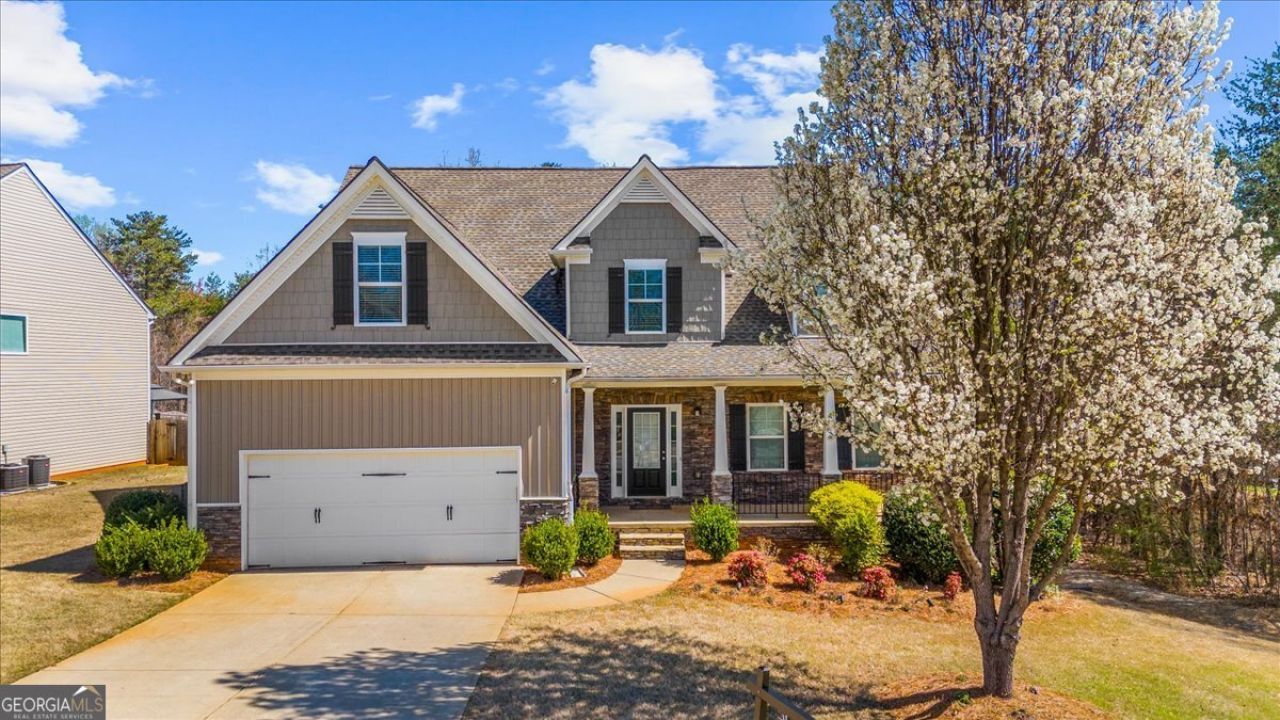 Renovated Southern Charm meets modern luxury in this stunning, move-in-ready Craftsman on a private 0.64-acre lot. This model offers one of the largest floorplans in this exclusive neighborhood. This home boasts a new roof (2022) new siding (2021), and fresh interior paint throughout. KITCHEN FRIDGE REMAINS WITH HOME. Inside, discover a bright floor plan revitalized with owner remodeled new tile flooring and plush carpeting. The soaring two-story family room features a magnificent ceiling-high stacked stone fireplace and views of the wooded backyard. The chef's kitchen is fully transformed with new granite countertops, refreshed cabinets, and all-new stainless appliances, connecting to a butler's pantry and formal dining for 12+. The main-floor primary suite offers a double-trey ceiling and private bath. Upstairs features well-appointed bedrooms including a Jack-and-Jill suite. Outdoor living excels with a new covered screened deck, a fenced yard, a cobblestone patio, and a level pad with power ready for a greenhouse. The spectacular fully finished basement is an entertainer's dream, featuring a dedicated theater/music room with a huge screen, projector mount, and custom lighting. This level also includes a padded workout/yoga area and a full bath. High-speed fiber is ready for gaming and remote work. High-value updates include a new main-floor HVAC and security system. Located in the top-rated Cherokee Bluff High School district near Flowery Branch Village Shops, this home offers the perfect blend of style and peace of mind.