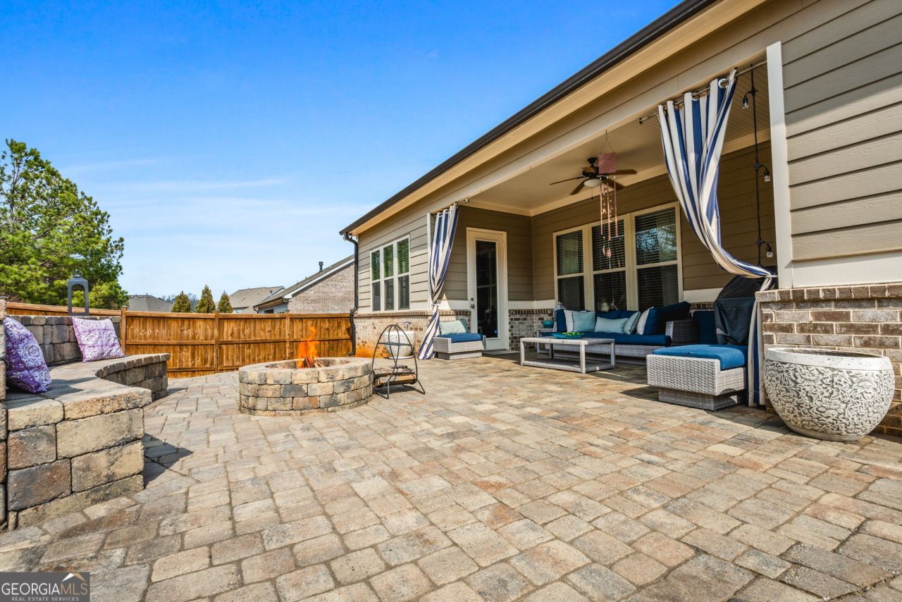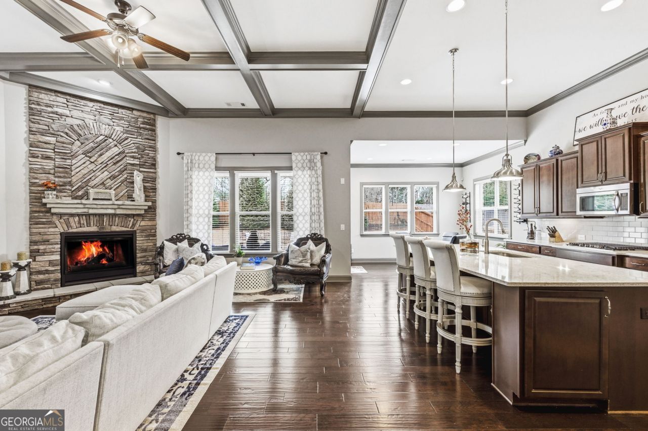 Immaculate Brick Ranch in Prime Forsyth Location - Former Builder Model This is the one buyers wait for. Beautifully maintained and truly like new, this 3-bedroom, 3-bath ranch in Woodbury Preserve offers effortless main-level living with exceptional upgrades throughout. Ideally located in sought-after Forsyth County just minutes from Alpharetta, Halcyon, Alpharetta Village, and the Big Creek Greenway you'll enjoy the best of both worlds: low Forsyth taxes with unbeatable convenience. Inside, the spacious family room impresses with a coffered ceiling and dramatic two-story stacked stone fireplace. The kitchen is thoughtfully appointed with 42 cabinetry, under-cabinet lighting, stainless steel appliances, ClosetMaid pantry system, and abundant prep space perfect for both everyday living and entertaining. As the original builder model home, this property is loaded with upgrades, including hand-scraped hardwood floors, enhanced trim throughout, custom drop-zone with beadboard, built-in seating and storage cubbies, framed mirrors in all baths, cabinet hardware, and a frameless glass shower in the owner's suite. Outdoor living shines here. Enjoy quiet evenings in your FULLY FENCED BACKYARD... on the large covered lanai with natural gas stub, or gather around the custom raised patio and firepit designed for relaxing and entertaining. Extras - Very oversized 2 car garage has ROOM FOR A WORKSHOP! Recent exterior paint...Woodbury Preserve offers outstanding community amenities including a pool, clubhouse, playground, open lawn space, and outdoor fireplace a welcoming setting to connect with neighbors. Zoned for highly rated Forsyth County schools: Midway Elementary, Desana Middle, and Denmark High. With Halcyon just down the street and the upcoming Gathering at Forsyth even closer, this location continues to grow in value and desirability. Homes in this condition in this location do not last. Welcome home.