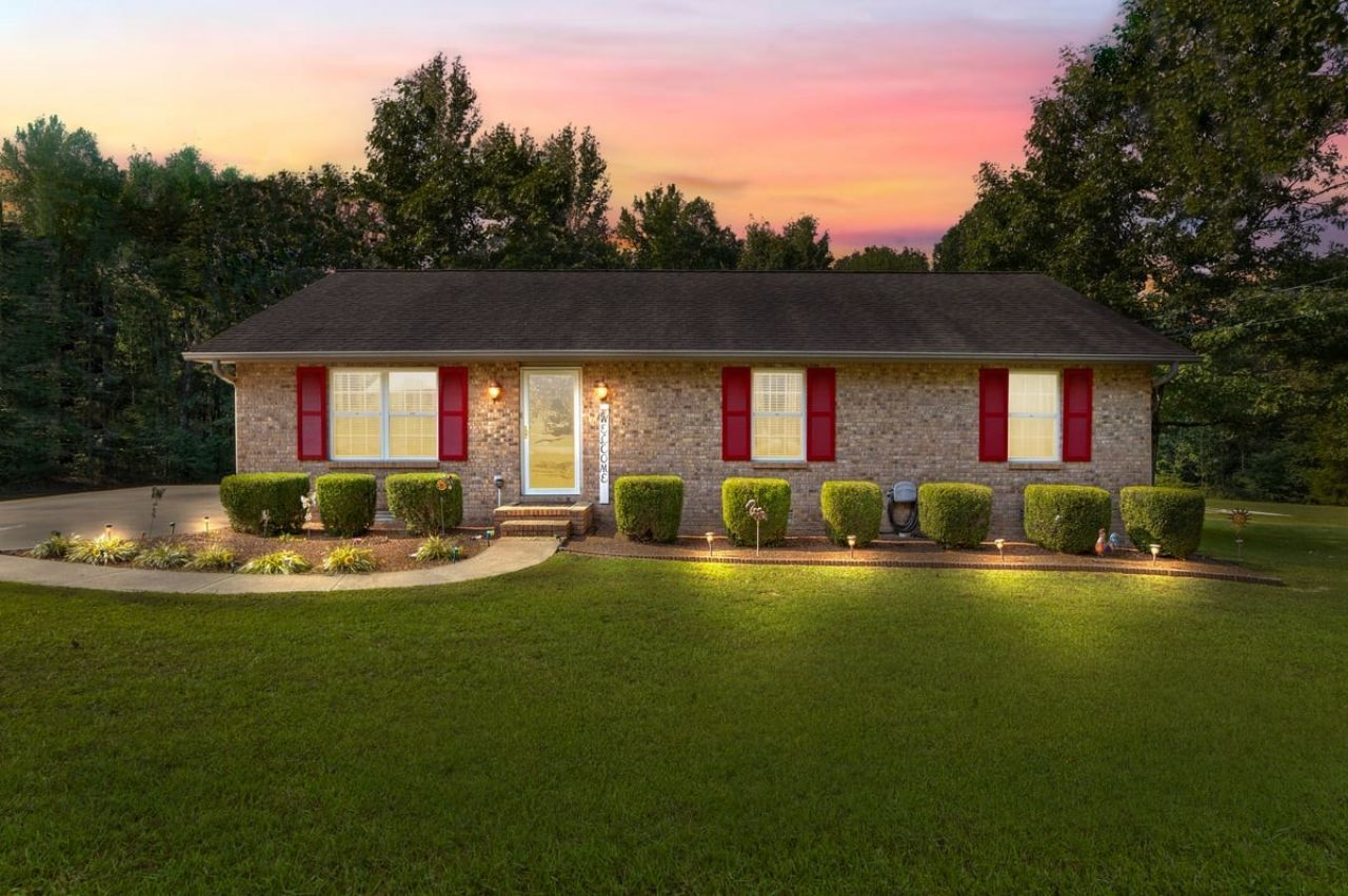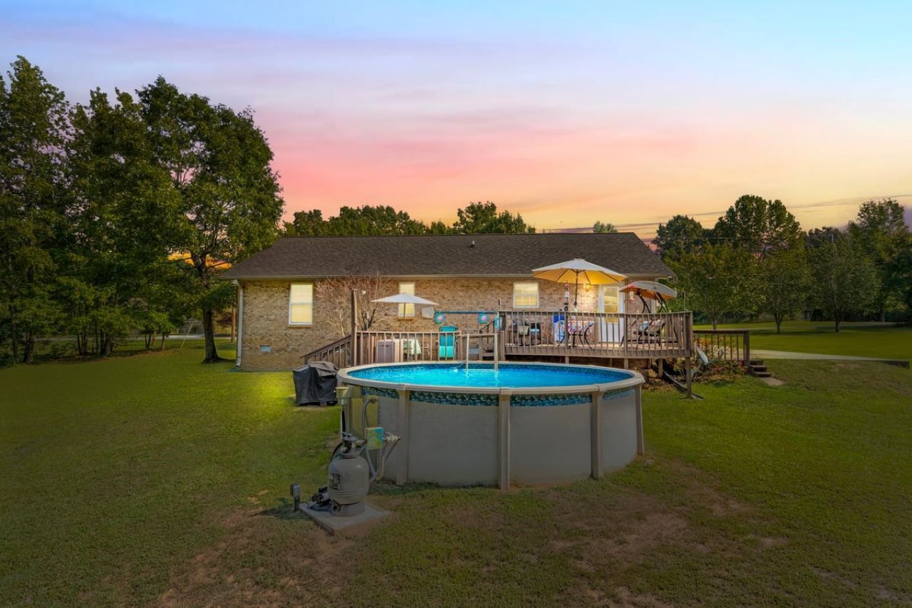 PARK-LIKE 1.69 ACRE PARADISE WITH A POOL - Charming curb appeal makes a stunning first impression. Well maintained home & grounds near the end of a quiet cul-de-sac. One-level living with waterproof laminate & ceramic tile flooring throughout. Primary bedroom provides a walk-in closet, double vanities & an oversized shower. Generous guest bedrooms each have spacious closets & access to a full hall bath. Open living area with lots of natural light from multiple windows. Eat-in kitchen with loads of cabinets storage & a large dining area. New 50 gallon water heater. Lovely lot lined with beautiful bradford pears in the front. Wooded back & side yard for ultimate peace and privacy. Take a walk to the rear of the property to a creek. Lounge on the tiered deck and watch the hummingbirds. Enjoy the outdoor shower after taking a swim. 10x16 storage building with electric & ramp for your lawnmower. Wide concrete drive for side by side parking. Lush landscape with shapely shrubs, hardy hostas & monkey grass. Natural gas is available at the road. Convenient to schools, shopping, Pebble Isle Marina & multiple boat ramps on the Tennessee River/Kentucky Lake.
