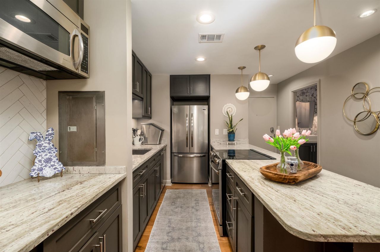 Fully renovated condo located in the historic Shrine Building! Wood floors throughout, granite countertops, stainless appliances including wine fridge, and new cabinetry. Bathroom has stylish vanity, walk-in shower and new tile. New HVAC 2020, new fridge, dishwasher & range 2023. Storage unit #19 on 9th floor included. The Shrine is just across from the new Memphis Museum, coming online at the end of 2026. You will be walking distance to great restaurants, FedEx Forum, the Orpheum and Beale Street. The building has so much to offer as well - large, heated, indoor swimming pool, sauna, workout area, bike storage, gas grills, and a beautiful rooftop deck with city skyline, bridge and Mississippi River views. Most residents rent parking in Premium Parking garage at Front and Madison.