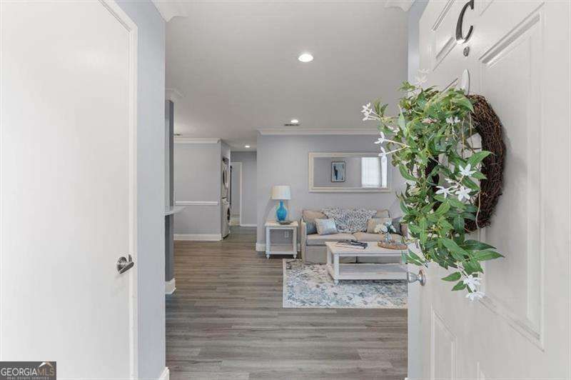 Welcome to this beautifully updated 2-bedroom, 1-bath first-floor corner condo in the gated Glenridge Park community in Sandy Springs. This move-in ready, single-level home features crown molding, recessed lighting and modern light fixtures, LVP flooring, and a stylish tiled fireplace with trendy fireplace balls that anchors the bright open living space. The designer kitchen showcases white cabinetry to the ceiling, quartz countertops, gas range, stainless steel appliances, and a modern backsplash, opening seamlessly to the dining and living areas-perfect for everyday living or entertaining. The spacious owner's suite includes a custom walk-in closet and light filled window. The updated bath features a brand new tub/shower surround, beautiful marble countertop and cabinet with updated hardware. A second bedroom offers flexibility for guests or a home office. Now, Step outside to the cozy covered porch, a peaceful spot to enjoy morning coffee or just unwind. Residents enjoy resort-style amenities including a pool, tennis courts, fitness center, grilling area, and abundant parking. Ideally located minutes from Perimeter Mall, Mercedes-Benz USA, and convenient access to MARTA, GA-400, and I-285, this home offers the perfect blend of luxury, convenience, and quiet gated living. A rare opportunity in the heart of Sandy Springs.