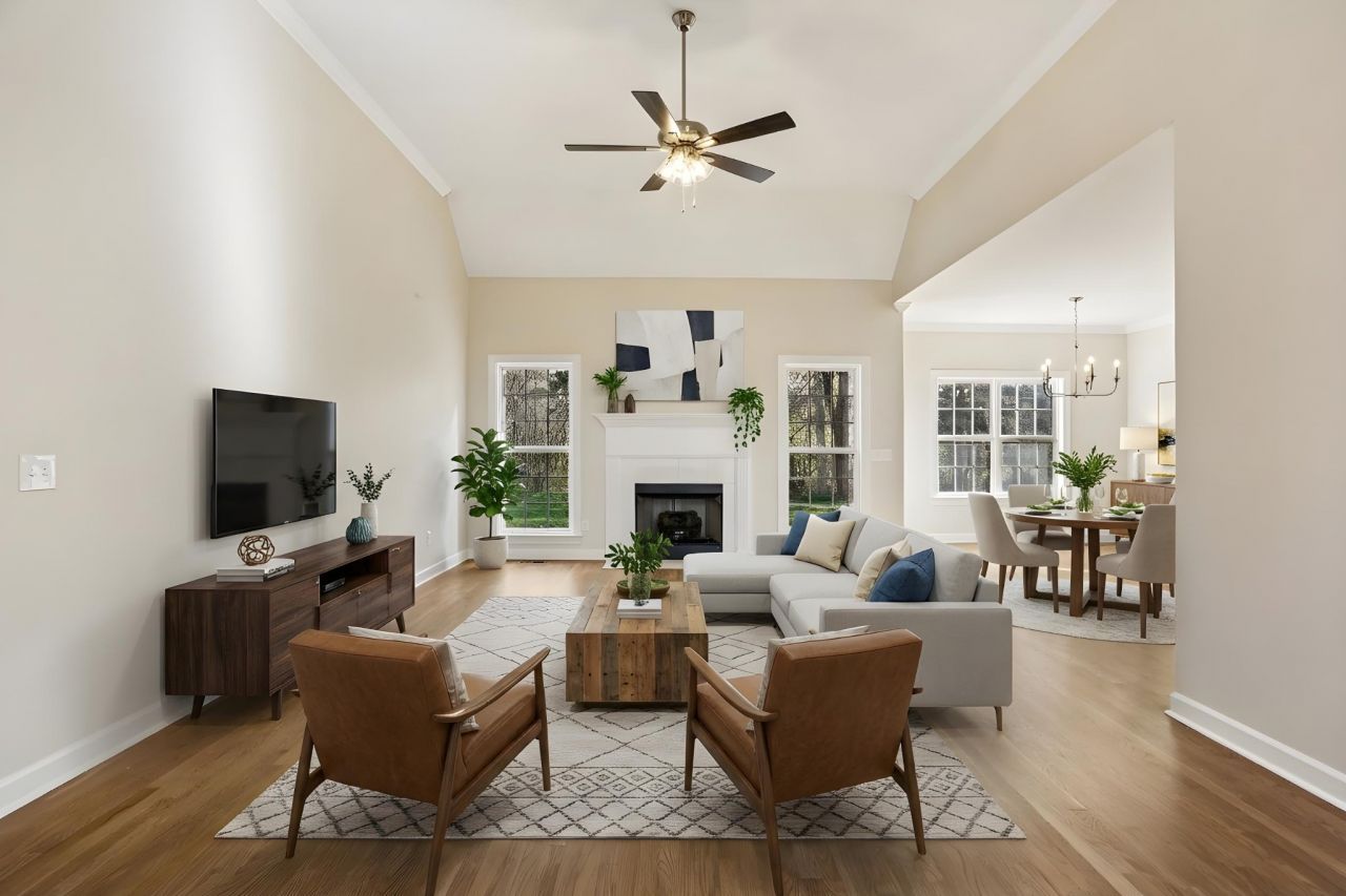 Welcome to 7025 Grindstone Way. This beautifully updated 4 bedroom, 3 bathroom home offers 2,998 sq ft on a spacious .35 acre lot, with oversized windows that fill the home with natural light. Fresh lighting throughout, hardwood floors across the main living areas and downstairs secondary bedrooms, and brand new carpet in the primary suite and upstairs make the entire space feel crisp, clean, and move in ready. At the heart of the home, the kitchen shines with bright white cabinetry, new quartz countertops, a new stone backsplash, stainless steel appliances, and new stainless fixtures and hardware. A sunny breakfast nook adds the perfect spot for morning coffee or casual meals, with plenty of space nearby for gathering and entertaining. The main level master suite is a true retreat, featuring a huge walk-in closet and a spa-inspired en suite bath with dual vanities, new quartz countertops, a large soaker tub, and an oversized walk-in shower with a premium glass enclosure. Upstairs, you'll love the huge loft over the garage, ideal for a bonus room, home gym, play space, or media room. Outside, enjoy the privacy of a backyard that backs up to the treeline, complete with a firepit and seating area ready for cozy nights with friends and family. An extra long driveway and attached 2 car garage provide plenty of parking and storage, and big-ticket updates like the new roof add peace of mind. Convenient to shopping, dining, and quick highway access, this home checks all the boxes for space, style, and location. Welcome home!