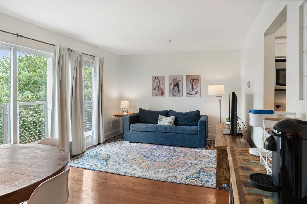 Fantastic short-term rental investment! This top-floor Riverfront condo, an Airbnb Guest Favorite, features a spacious bedroom with walk-in closet and full bath, an open living/dining area with sleeper sofa, and a fully stocked kitchen designed to host up to 4 guests. The large private balcony offers stunning views of Nashville's evolving riverfront. Whether you're seeking a fully turn-key NOO-STR or a place to call home, this condo checks all the boxes. This prime location is walking distance to the vibrant restaurants, shopping, and all that Nashville has to offer. Riverfront Condo's amenities include a pool, fitness center, fire pit, grills, laundry room, and free covered parking with room for all. Ask agent for rental and revenue history.