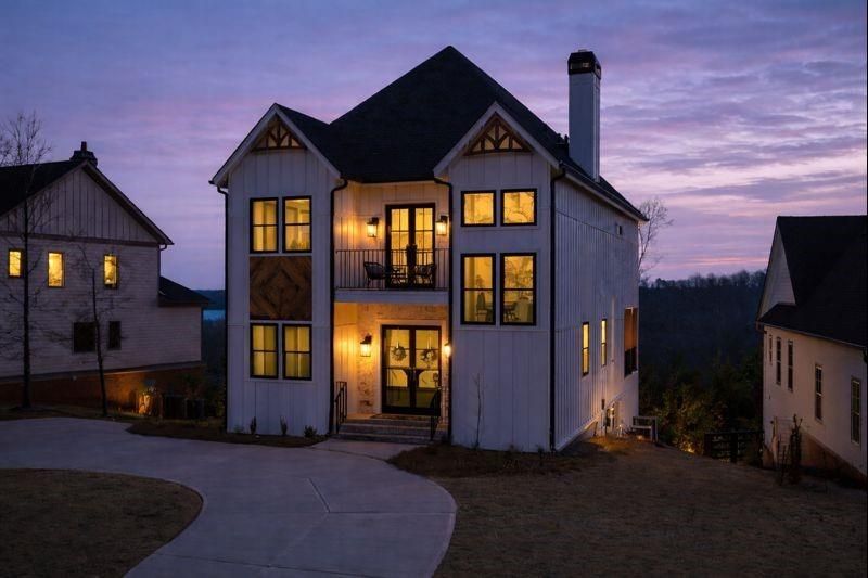 Modern luxury meets Lake Living in the Gated The Reserve Club & Marina. This Architecturally Distinctive Home offers Beautiful Lake and Mountain views throughout, Exceptional craftsmanship, and a Full Terrace level - all within one of Lake Lanier's premier lake-access communities. From the moment you arrive, the Home delivers Unforgettable curb appeal with its Circular driveway, Whitewashed Brick accents, Board-and-Batten siding, Warm wood detailing, and Dramatic gabled rooflines illuminated by Lantern-style lighting. Double wrought-iron Marcy doors open to a Bright, Refined Foyer featuring custom wood trim, a wrought-iron staircase, and clear sightlines to the German-Schmear Stacked-stone Fireplace crowned with a Wood-beam Mantel. The cohesive Stonework continues into the Kitchen, reinforcing the home's Rich, Textural design. Thoughtfully crafted Hidden Doors offer an elevated touch?one leading from the Family room and another concealing a Butler's pantry with Generous storage, Countertop space, a Wine/beverage Fridge, and its own Sink with Glass Rinser. The Open-concept Main level showcases a Dramatic Two-story Dining area, an inviting Family room, and a Flexible office or Fitness space. A Designer Half bath with Statement Tile adds a Magazine-worthy moment. The Chef's Kitchen is a statement in both Design and Function, highlighted by Custom Matte Quartz Countertops, an Apron-front Farmhouse Sink with Glass Rinser, and an Oversized Waterfall-edge Island with a Secondary sink. Double wall ovens, a Chef-caliber Forno 8-burner commercial-style Gas range with griddle and pot filler, and Elegant lighting bring a Polished, Elevated finish to the space. Wrought-iron doors open to the Covered Main-level Balcony, an ideal year-round Extension of the Living space, perfect for Dining, Lounging, and Entertaining. Upstairs, custom Paneled Walls lead to a Cozy Flex Retreat with a Modern Fireplace wrapped in Concrete-style Paneling. The Owner's Suite is a private Sanctuary, offering Tri-fold Wrought-iron glass doors to a Covered Balcony with Tranquil Lake views, a Wet bar with Wine fridge, a Custom Walk-in closet, and a Spa-inspired bath featuring a Freestanding Soaking tub, Frameless glass shower, double vanity, and thoughtfully curated finishes. Two additional bedrooms and two full baths with Stunning Tilework, along with a Laundry Room featuring upgraded Tile finishes and a Sink, complete the upper level. The Finished Terrace level offers remarkable versatility - ideal as a Guest or In-law suite, Young Adult retreat, or Entertainment Level. It includes a Media room, Wet bar (easily convertible to a Full Kitchenette), Second laundry room, Spacious bedroom, and upgraded Full bath. All bathrooms are also equipped with Bluetooth speaker Exhaust fans featuring Color-changing lighting, while in-ceiling Surround Sound speakers are installed throughout the home. The oversized side-entry Garage includes an EV charger and an Extended parking pad, providing abundant space for Vehicles, Storage, and Recreational gear. For enhanced energy efficiency, the home features spray-foam insulation and a tankless water heater also includes a transferable 2-10 Builder Warranty for added peace of mind. Experience Luxury Lake Living with access to Lake Lanier, including a Community dock with Day-use slips for residents and the opportunity to rent covered boat slips from owners when available. A Resort-style Pool and Clubhouse round out the