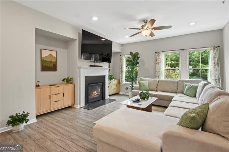 END UNIT with Tons of natural light! Discover modern luxury and convenience! This 4 Bedrooms 3.5 bathrooms three-story townhome provides flexible living spaces. The first floor offers a private bedroom and full bath, perfect for a guest suite, home office, or a family member seeking a quiet retreat. The second floor is the heart of the home, featuring an open-concept design that seamlessly blends the sun-filled living room, dining area, and a gourmet kitchen, which opens out to the deck with a fabulous view of the community. The third floor is dedicated to rest and relaxation. A spacious owner's suite provides a peaceful sanctuary with a spa-like ensuite bath. The third floor also includes two additional bedrooms and another full bathroom, offering plenty of space and privacy for the entire family. The home features beautiful hardwood and carpet flooring, a fireplace for cozy evenings, and modern fixtures throughout. Situated less than a minute from I-575, this home offers an incredibly easy commute. You're also just a short drive from the Woodstock Outlet Shoppes at Atlanta, Costco, and a variety of other shopping and dining options. Enjoy the vibrant charm of downtown Woodstock, which is within walking distance and offers a plethora of restaurants, boutiques, and community events. This property is zoned for excellent Cherokee County schools, including Woodstock Elementary, Woodstock Middle, and Woodstock High School. Residents of this community enjoy access to a swimming pool, and the HOA fee includes landscaping and trash services, providing a low-maintenance lifestyle. Don't miss your chance to own a piece of Woodstock's best. READY TO MOVE IN!