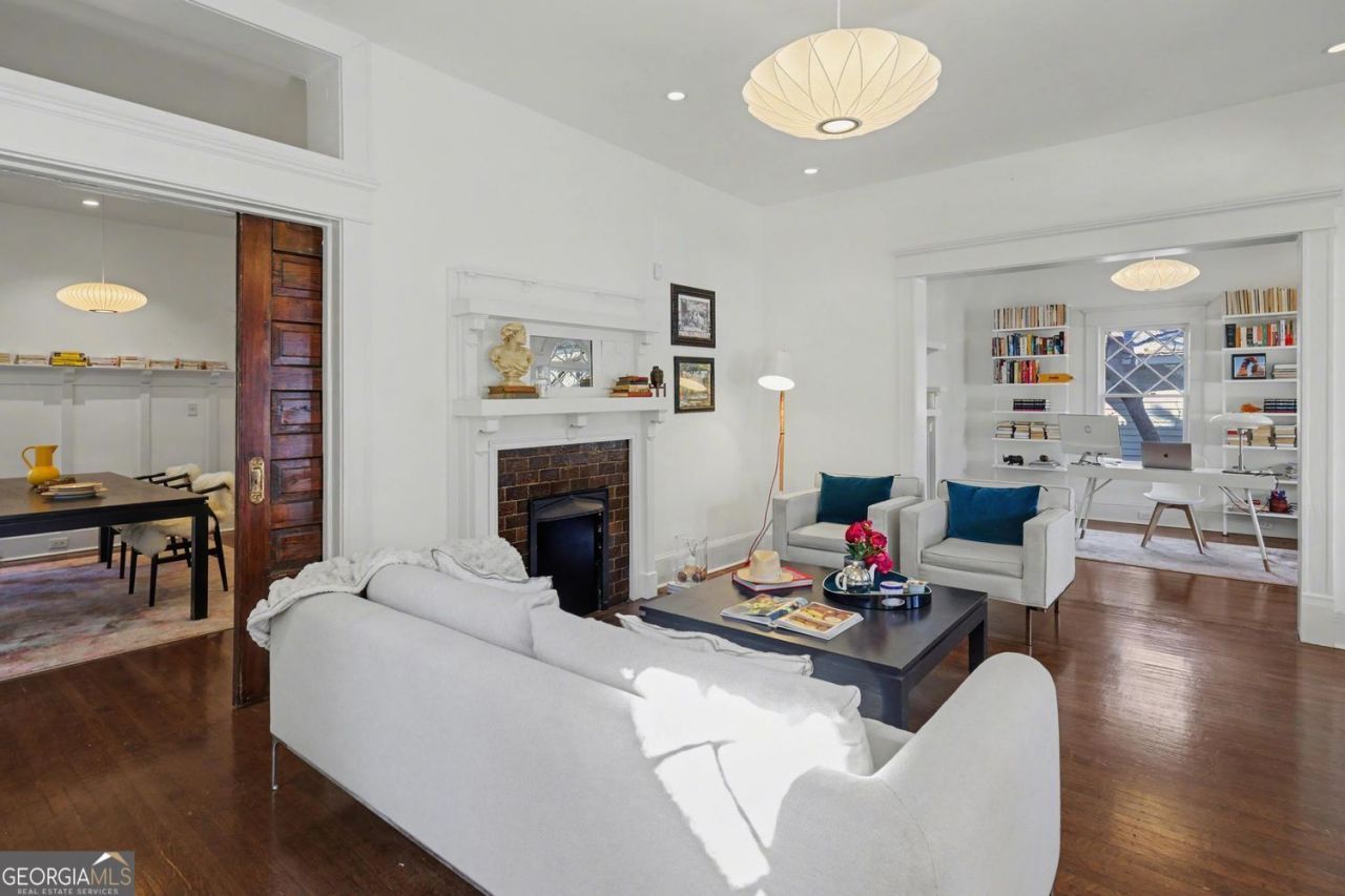 Tucked along one of Midtown's most charming and quiet streets, this restored 1910 Craftsman bungalow blends historic character with a modern feel. A welcoming front porch opens to a light filled interior featuring original oak floors, diamond paned windows, ten foot ceilings, pocket doors, four fireplaces, and beautifully preserved millwork that speak to the craftsmanship of a bygone era. The interior has a bright, modern energy that complements the home's classic architecture. The layout lives well, offering a main floor owner's suite with an updated bath, a light filled kitchen with island and coffee bar that opens to the porch, two secondary bedrooms on the main level, and a large flexible upstairs with additional rooms ideal for a bedroom, studio, or bonus space. The backyard has been thoughtfully transformed into a private retreat with turf, a charming bridge over a water feature, and a parking pad to charge an electric car, all set beneath a magnificent century old sycamore tree. Multiple outdoor spaces make it easy to relax or entertain. With easy access to Piedmont Park, the BeltLine, and Ponce City Market, this home offers a rare combination of walkable city living and peaceful residential charm. A special opportunity for those who appreciate character, creativity, and timeless design in the heart of Midtown.
