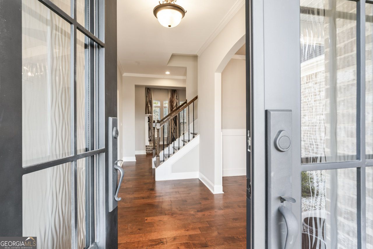 Situated on a spacious lot within a quiet cul-de-sac, this impressive residence offers a commanding view of the street and a true sense of privacy. With five bedrooms, four and a half bathrooms, and over 3,900 square feet of living space, the home is designed for both comfort and functionality. The exterior features a welcoming front porch and a pristine three car garage, reflecting a property that has been meticulously maintained. In the rear, a screened porch provides a peaceful retreat overlooking a private wooded backdrop, perfect for quiet evenings or hosting guests. The interior features an open floor plan where natural light emphasizes clean lines and high quality finishes. A formal dining room and a dedicated home office provide designated spaces for both entertaining and productivity. The kitchen is expertly designed with stainless steel appliances, a wide center island, and durable tile flooring. It flows seamlessly into a great room characterized by high ceilings and elegant architectural details, with direct access to the back porch. The primary suite is located on the main level for maximum privacy, featuring a spacious bathroom with dual vanities and a large walk-in closet. The second floor offers a second suite, three additional bedrooms, and a versatile bonus room ideal for a media center or play area. Located in the gated community of Eagle's Brooke, residents enjoy a resort style zero entry pool, nature trails, and a calm atmosphere. The property is conveniently positioned near Strong Rock Christian School, the interstate, and local shopping and dining. This is an exceptional home that is move in ready for its next owners.