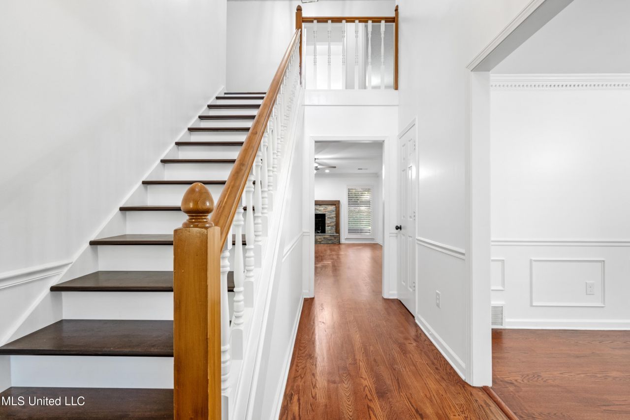 This beautifully updated 4 bedroom home is ideal for multi-generational or blended households, offering space, privacy, and flexibility. Recent upgrades include an updated kitchen, new bathrooms, refreshed flooring and lighting, and fresh paint inside and out. The thoughtful layout features front and rear staircases, a formal dining room with plantation shutters and dentil molding, and a spacious family room with fireplace. A private main-level office or sunroom provides excellent flexibility for guests, caregivers, or quiet retreat space. The primary suite on the main floor offers separation from secondary bedrooms, along with an enormous walk-in closet and spa-style bath. Upstairs includes three additional bedrooms or two plus a large bonus room, allowing space for extended family, hobbies, or guests. Hardwood flooring throughout--no carpet. All appliances remain. Set on a private, elevated lot with a front porch swing and new deck, this home balances connection and personal space. Located in Riverwood Farms, featuring a lake, trails, picnic area, school, and security patrols--perfect for households needing room to live comfortably together.