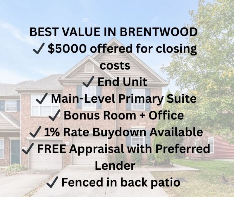 Rare opportunity to own an end-unit Brentwood townhome under $380K, now offering $5,000 toward buyer closing costs plus a preferred lender incentive that includes a 1% rate buydown credit and a FREE appraisal when working with Hilary Hollingsworth-helping reduce both upfront costs and monthly payments.This move-in ready 3-bedroom, 2.5-bath home features a main-level primary suite with an oversized walk-in closet, plus a versatile upstairs layout including two additional bedrooms, a spacious bonus room, and a flex space with French doors ideal for a home office, fitness room, or playroom.Recent updates give the home a fresh, modern feel, including brand-new neutral laminate flooring throughout the main level and an upgraded staircase with a striking wood design and black-and-white contrast. The kitchen has been enhanced with custom upper cabinets for additional storage and a more elevated, functional layout, perfect for everyday living or entertaining.As an end-unit townhome, the property offers additional privacy and abundant natural light throughout. Outside, enjoy a fully fenced private patio that's perfect for pets, grilling, or relaxing outdoors. The attached one-car garage has been upgraded with Fleximount overhead storage, providing excellent space for organization, plus two additional parking pads for convenience.Additional peace of mind comes from the recently replaced roof maintained by the HOA, helping reduce long-term maintenance concerns. The community also includes exterior maintenance, grounds maintenance, and trash pickup for low-maintenance living.Conveniently located just minutes from Publix, Kroger, shopping, dining, and popular Brentwood and Nolensville restaurants, this home offers an ideal balance of comfort, functionality, and location.