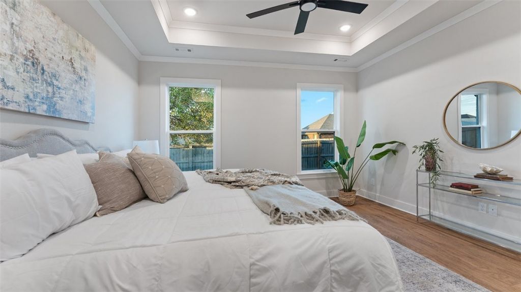 This gorgeous home sits right across from Gamble Elementary, and it's got a layout that just makes sense. On the main floor, you'll find two bedrooms and two full baths, and upstairs there are two more bedrooms, another full bath, plus a big theater/game room that's perfect for movie nights or hanging out. It's loaded with thoughtful upgrades ? tall ceilings with beautiful banister railings, quartz countertops, tiled showers, an electric fireplace, and even a gas line ready for your outdoor grill. The kitchen is a dream with custom cabinets, a huge walk-in pantry, and luxury vinyl floors all through the first level. The garage even has a charging port for your electric car. And with Gamble Elementary and Bentonville West High School just a short walk away ? plus quick I-49 access ? you're only minutes from downtown Bentonville and the Walmart Home Office.