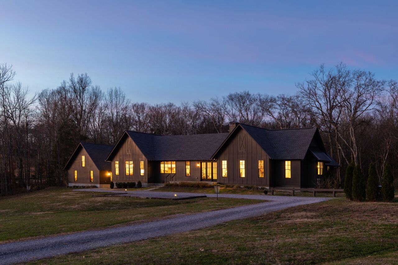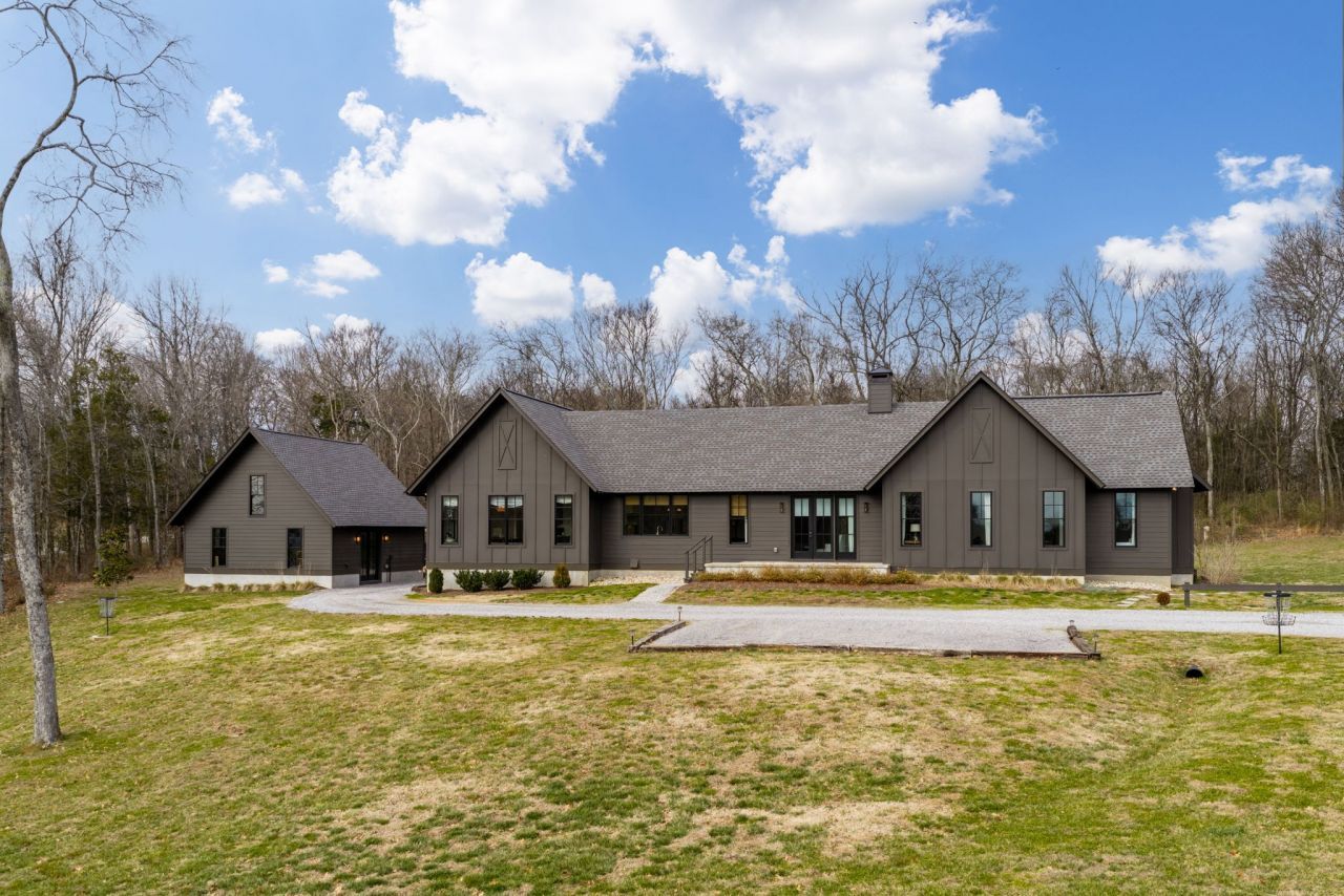 Ultra-private, 12-acre estate, in the heart of Franklin with NO HOA & easy access to Nashville. This exceptional, 1-level, architect-designed farmhouse offers a rare harmony of refined architecture, milled Walnut (from the property) & the authentic rhythms of Tennessee horse country. Conveniently located just 5-minutes to multiple grocery stores & 1-mile from an equine vet. Bonadies Architects designed this stunning residence; thoughtfully imagined for single-level living. Clean lines define the exterior: striking black metal roofing sweeps over deep charcoal board-and-batten siding, complemented by exposed rafter tails and subtle standing-seam accents. Expansive walls of glass frame views of the surrounding landscape & drench the home in natural sunlight. The heart of the home centers on an open, vaulted great room that flows effortlessly into the gourmet kitchen & formal dining room. French doors open directly onto a sheltered interior courtyard, perfect for a swimming pool, creating a natural extension of the living space that backs to acres of woods & trails. Separate wings extend from this central core to enhance privacy & functionality. The primary wing provides a serene retreat with a cathedral-ceiling bedroom, elegantly appointed bath, ample walk-in closet, and a dedicated office overlooking the wooded grounds. This wing has a separate, covered rear entry that opens to a large boot room with brick flooring, laundry facilities, and drop zone. The guest wing offers three additional bedrooms, en-suite bathrooms, a game room, & a breezeway from the pasture for horse riders. The property combines seamless access to the area's finest amenities with the quiet pleasures of equestrian life. Time spent here feels both timeless and entirely contemporary-a curated sanctuary where memories will flourish & legacies grow across generations.