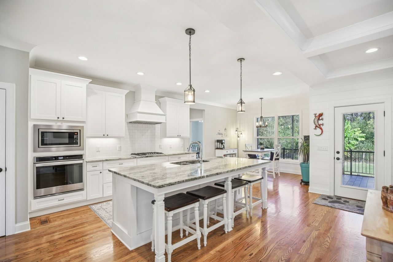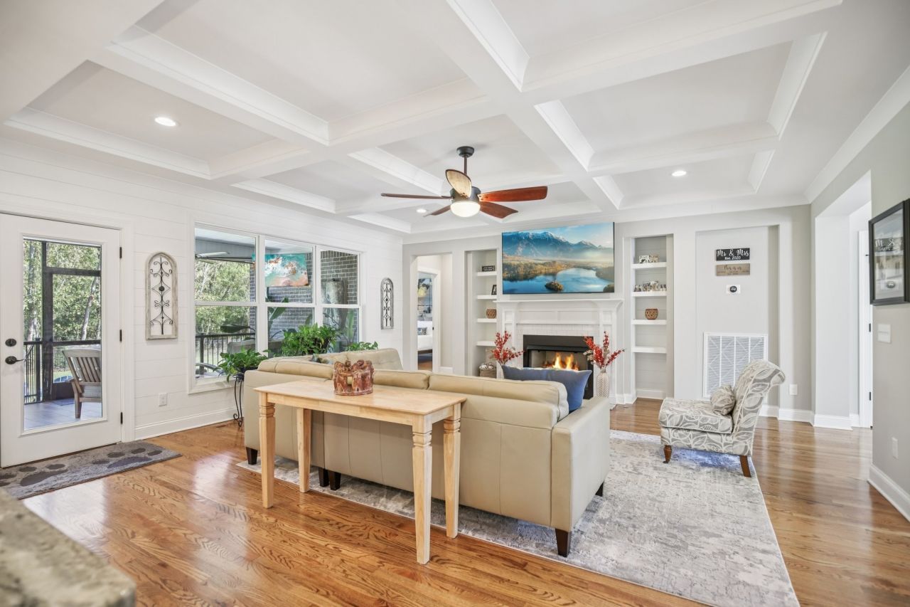 Step inside this gorgeous 3-bedroom, 3 full, 2 half bath home and be immediately impressed by premium details, including upgraded hardwood and tile flooring, custom built-ins, coffered ceilings, and custom closets throughout. The kitchen features a massive gathering island, bright white soft-close cabinetry, a gas cooktop, subway tile backsplash, upgraded Bosch appliances, and a sunny breakfast nook. All three bedrooms are conveniently located on the main level. The Primary Suite offers beautiful views, an ensuite with a standing tub, a large tiled shower with a glass enclosure, a dual vanity, and a massive walk-in closet with custom wood shelving. The two secondary bedrooms also boast large walk-in closets and private ensuite full bathrooms.Relax and enjoy the screened porch or patio overlooking the private, fenced yard, which backs directly to Corps of Engineers land, guaranteeing no rear neighbors. Property line extends to the second fence on the left side of the home. Additional features include a dedicated office, formal dining space, a great room with a cozy fireplace, a laundry room with built-in sink and cabinets, and an oversized 2-car garage measuring 30 by 23 feet, with plenty of room for garage cabinets or storing a golf cart for trips to the nearby golf course or neighborhood restaurants.Upstairs, the spacious bonus room with an attached half bath offers flexible space that could easily serve as a fourth bedroom and provides attic access for extra storage. Lovingly maintained and thoughtfully updated, this home is ready for its new owner. Schedule a tour today to see it in person.