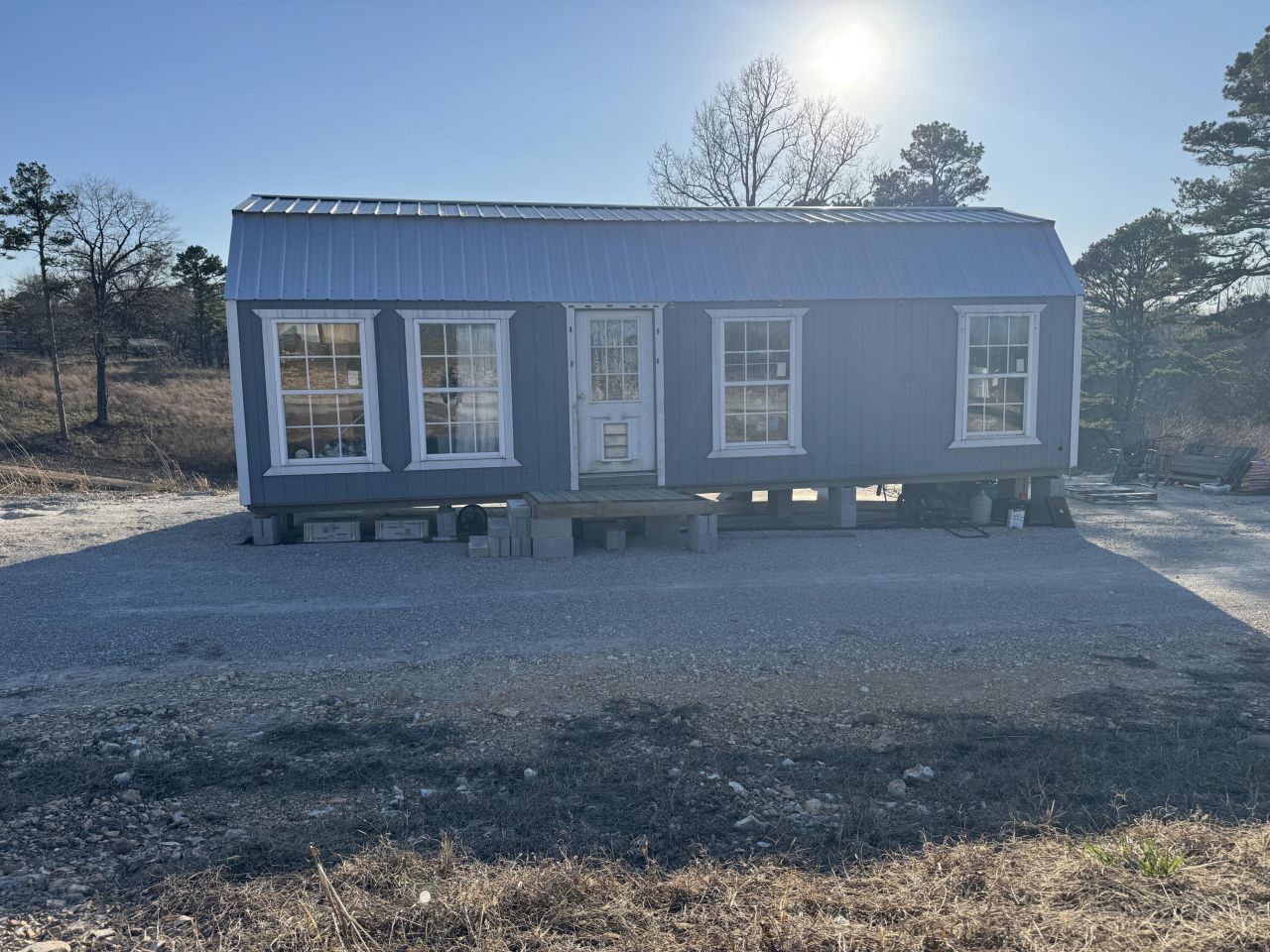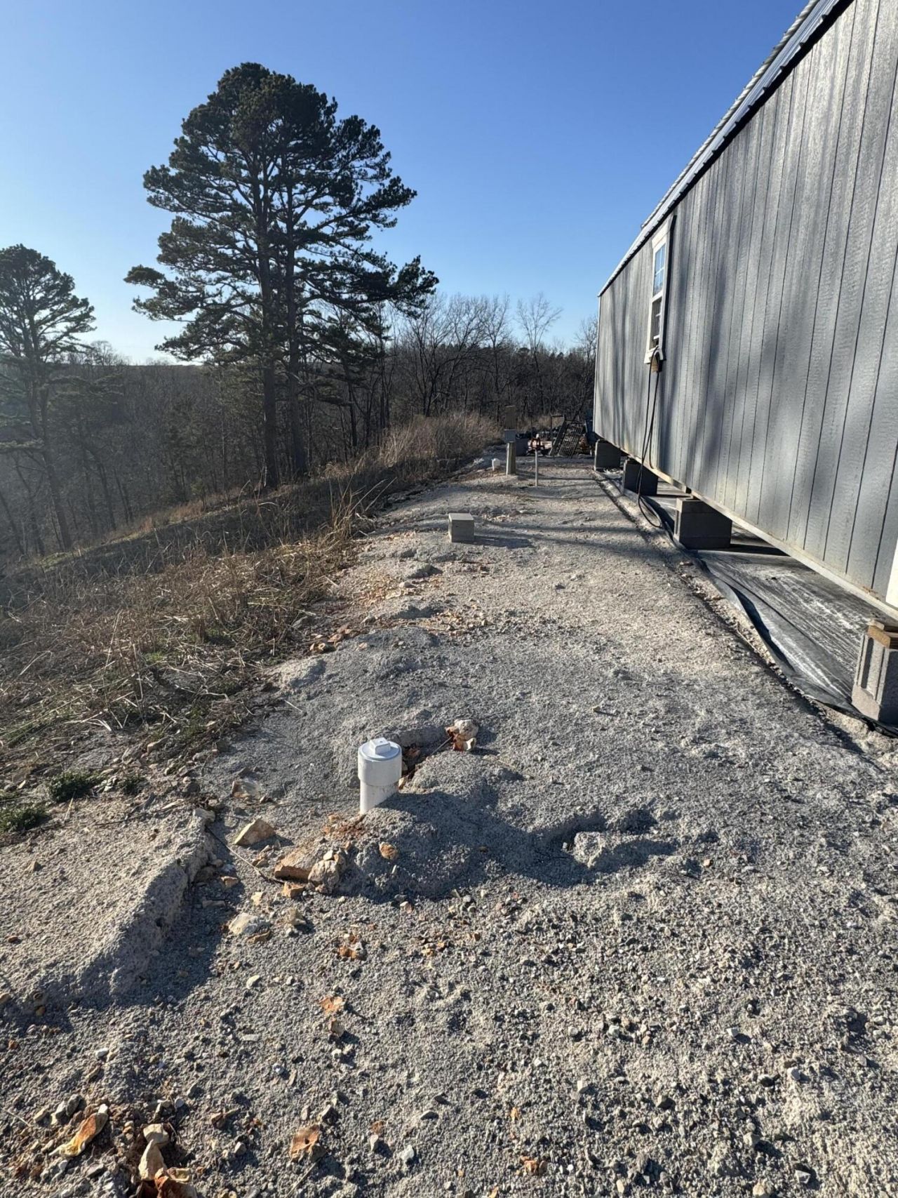 5.02 acres with leveled pad set up for camper living (camper does not convey). Includes 12x32 building with kitchen area, sink, and bathroom which will need finished . Property features shared water, One septic system, and two electric hookups. Ready for residential or recreational use.