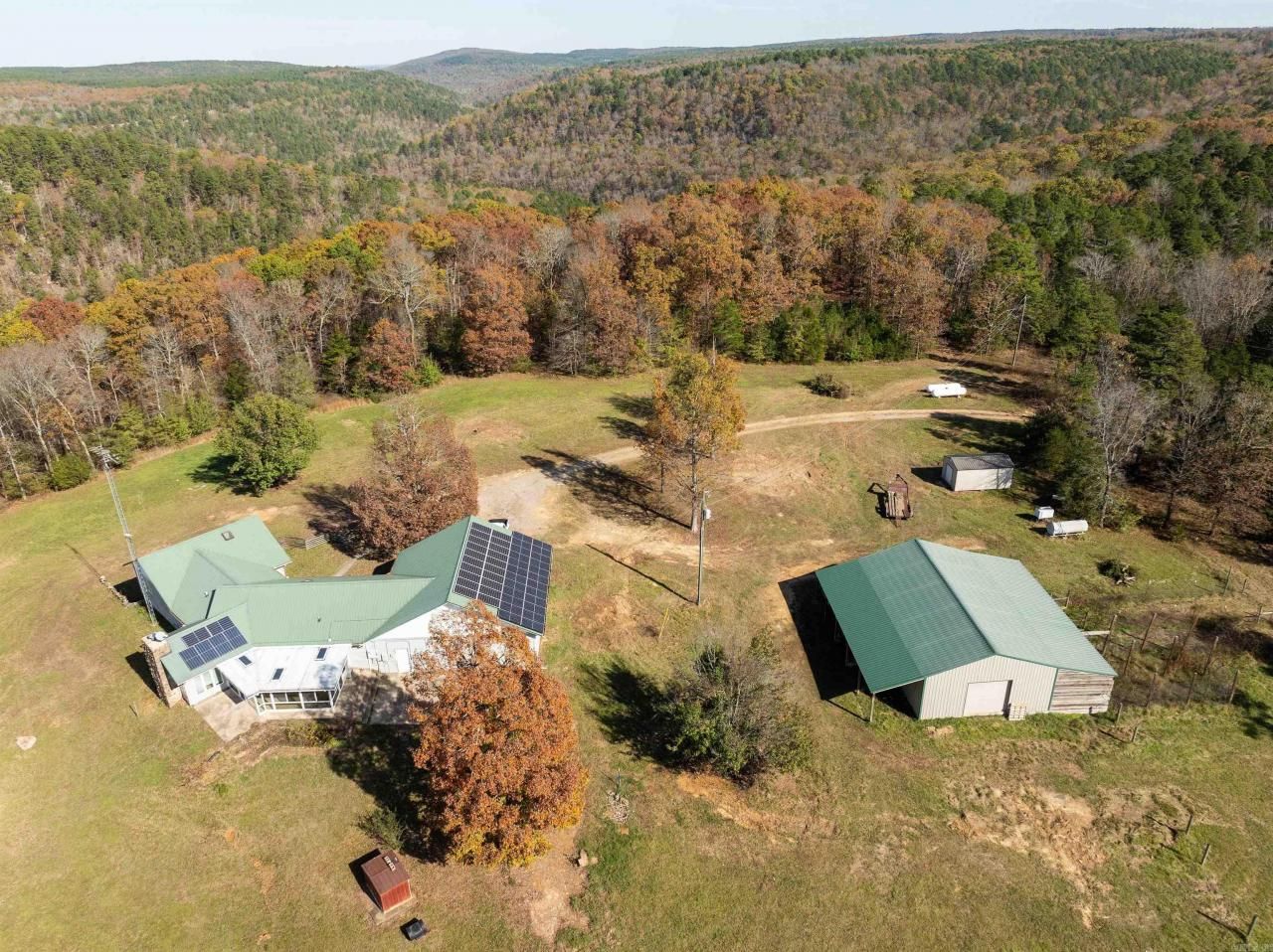 220 Acre Private Sanctuary in a stunning off-the-beaten-path property. Expansive 4 bedroom home has maintenance-free exterior and located in the middle of a nature lovers dream. Equipped with solar panels, home generator, and (2) 1000 gallon propane tanks this home offers sustainable living with peace of mind. Property is bordered by Five Mile Creek and converges with Wolf Bayou. Explore the dozens of caves scattered throughout the landscape, or unwind with your private fishing lake or simply hiking around undisturbed. For those with livestock, the property includes a dedicated area with partial fencing and pens, making it ideal for a mini-farm setup. Property also features A large 30x50 enclosed shop, 30x60 covered storage area & multiple building sites. Whether you're wanting to sit and relax on the back porch or inside your sunroom overlooking the mountain side and pasture, this property features it all. Showings are by appointment only and require a gate code to enter. Call Agent Today!!
