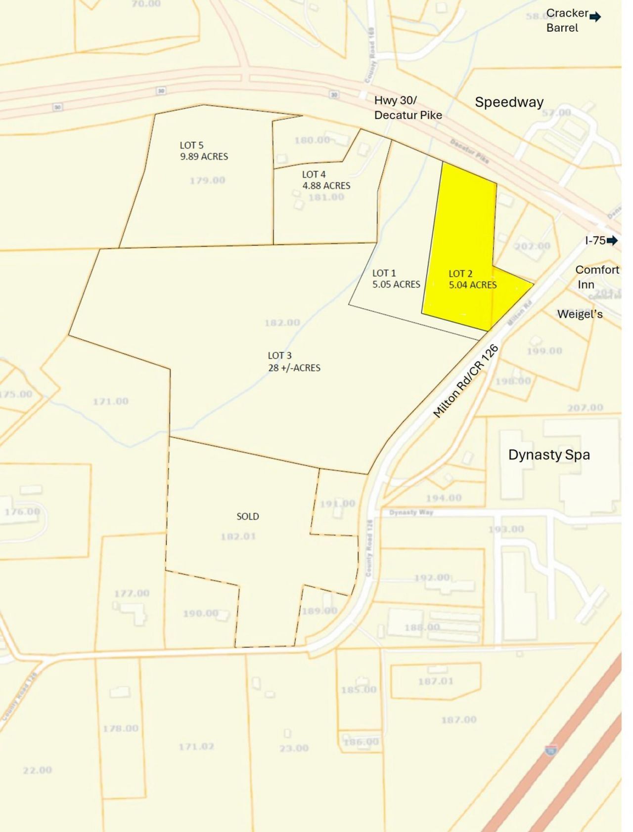 Call all Hotel, Restaurant, Fast Food, Retail Developers! Property is adjacent to Comfort Inn and Weigel's, across Highway 30 from Speedway Gas StationHighway 30 Frontage Near I-75, Exit 49, Athens, TNLocated approximately 1,300 feet West of Interstate I-75, Exit 49Lot 2 Total Size: 5.04 ± acresSee Investment Highlights for info on the total of 52.86 acres available for purchaseAdditional connecting acreage with B3 Zoning is availableNewly surveyed tract carved from parent parcel 046182.00 and incorporates former parcel number 046 201.00 for egress/ingress from both Hwy 30 and Milton Road/County Road 126.Lot 2 consists of dual zoning jurisdictions:* 2.67�± acres located within the City of Athens, zoned B-3 (General Business), allowing for a wide range of commercial and retail uses.* 2.37�± acres located in McMinn County, currently zoned Agricultural, offeringpotential for rezoning or complementary uses subject to county approval.Dual zoning offers development flexibility.Lot 2 is part of a larger assemblage totaling 52.86 acres, listed by the same agent. The assemblage includes five adjoining parcels owned by two cooperative owners, allowing for flexible assemblage opportunities.Ideal for retail, service, or highway-oriented commercial uses.Survey available.Price: $150,000 per acre ($756,000)The site's high-visibility location near a major interstate corridor makes it well suited for retail, service, mixed-use, or highway-oriented commercial development. Dual zoning allows an investor or developer to phase development or strategically allocate parking, stormwater, or future expansion across the site.Ideal for developers seeking interstate proximity, strong visibility, and zoning flexibility in Southeast Tennessee. The property is located approximately halfway between Knoxville and Chattanooga, TN.(Click the ''More'' button for additional info) Location allows for a wide range of potential uses, including but not limited to:Hotels, motels, and lodgingRestaurants (including drive-thru, subject to approval)Retail stores and shopping centersProfessional and medical officesAuto-related services (sales, service, parts - subject to use review)Banks and financial institutionsPersonal and business servicesMixed-use commercial developmentsBuyer to independently verify all permitted and conditional uses with the City of Athens Planning Department.Permitted-Use Highlights B-3 Zoning - City of Athens (Buyer to Verify)High-visibility Highway 30 frontage with secondary ingress/egress access from Milton Road / County Road 126QSR / Restaurant / Convenience RetailExcellent location for: Quick-service restaurants Drive-thru concepts (subject to site plan approval) Coffee, fast-casual, or convenience retailInterstate proximity supports both local traffic and interstate travelers, and the dual zoning allows parking, stormwater, or future expansion to be handled efficiently across the site.Hotel / Hospitality / Short-Term LodgingWell positioned for: Limited-service or select-service hotel Extended-stay concepts Hospitality with supporting retail or diningClose access to I-75 makes this attractive for travel-driven demand while remaining within city limits.Auto / Service / Fuel UsersHighway 30 frontage and I-75 proximity support: Auto sales or service Tire, oil change, or quick-lube Car wash (subject to approvals) Truck or fleet service (county portion may support complementary uses) Fuel or convenience concepts (buyer to verify)Buyer to independently verify zoning, utilities, permitted uses, and development requirements.